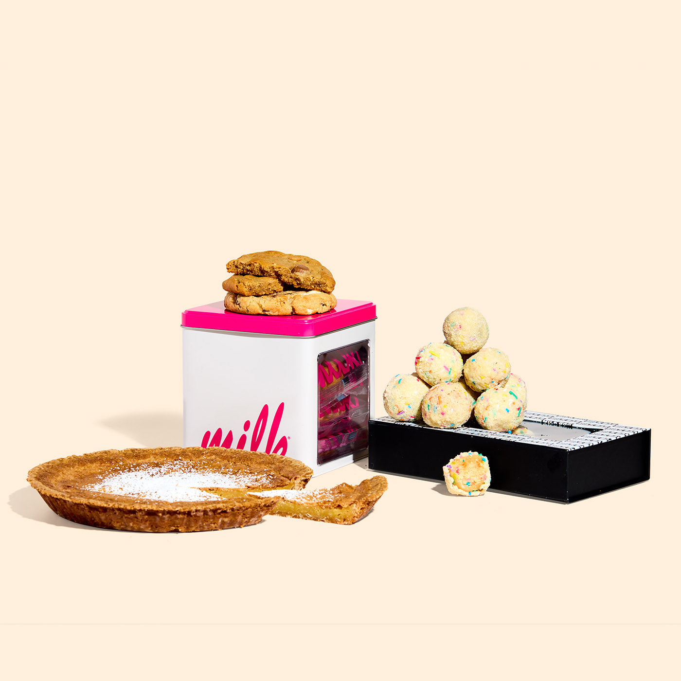 The Sweet Spot includes: 1 Milk Bar® Pie, 1 Dozen B’Day Truffles, 1 Assorted Cookie Tin for a total of 6 cookies (1 Compost Cookie®, 1 Confetti Cookie, 1 Cornflake Chocolate Chip Marshmallow Cookie, 1 Triple PB Cookie, 1 Chocolate Chip N’ Chunk Cookie and 1 Oatmeal Cream Cookie).